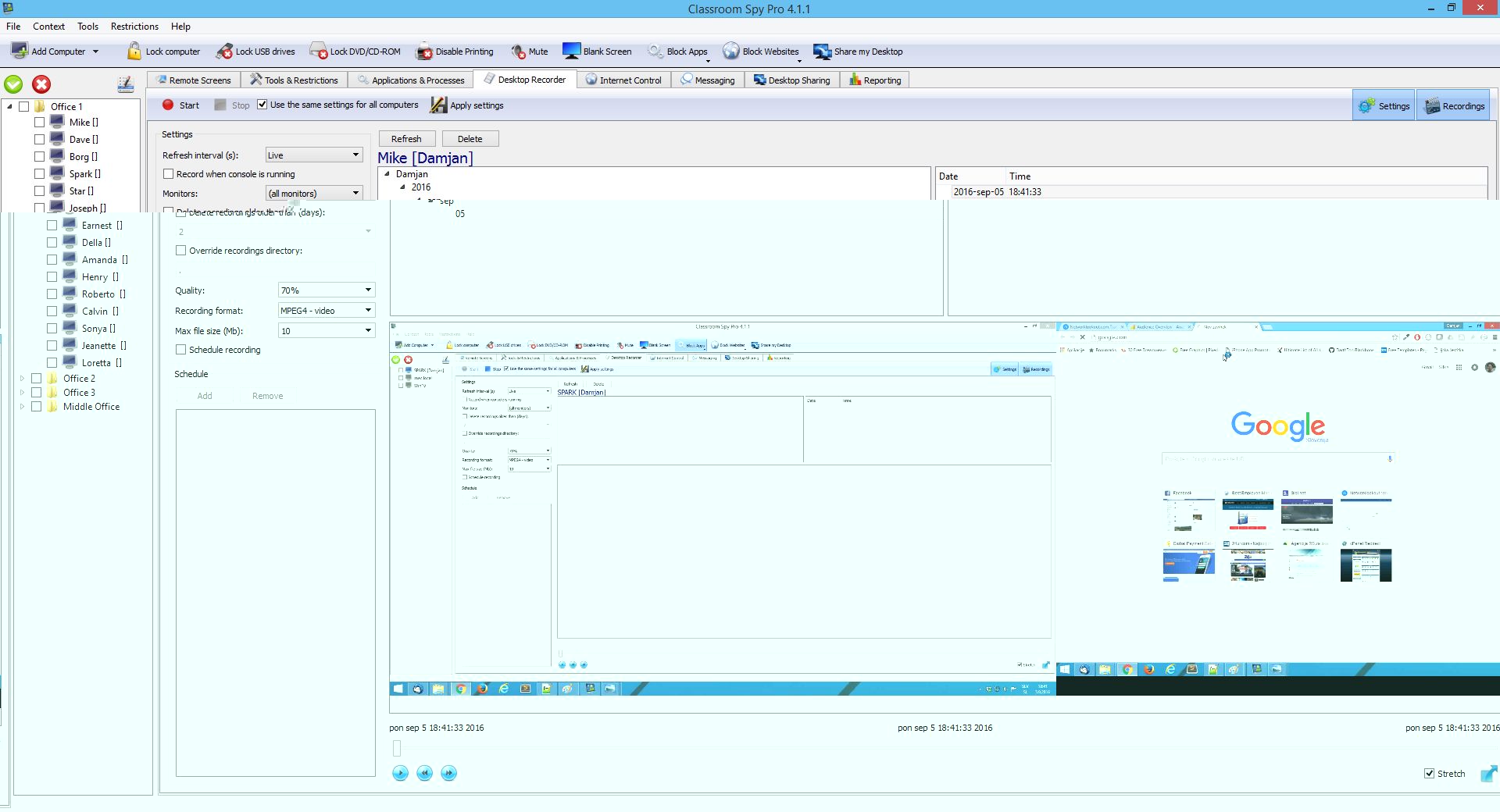 Computer Screen Recorder allows you to record student's screen either at specific intervals or in live video. Recorded screens are saved in MPEG4, MKV (video) or JPEG (screenshots) format.